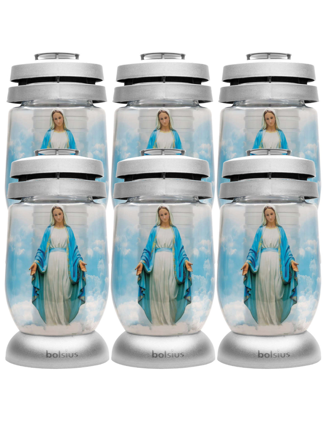Ozdobne lampiony z wizerunkiem Maryi. Wykonane z wysokiej jakości przeźroczystego szkła, przez które pięknie widać płomień. Dzięki dużej podstawie są bardzo stabilne, a za sprawą specjalnej konstrukcji oraz „kapturka” wkłady w ich wnętrzu są doskonale chronione przed wiatrem i wodą. Eleganckie i nowoczesne, wspaniale prezentują się jako główna dekoracja nagrobków. Pasują do nich parafinowe i olejowe wkłady, które palą się nawet 4 dni.