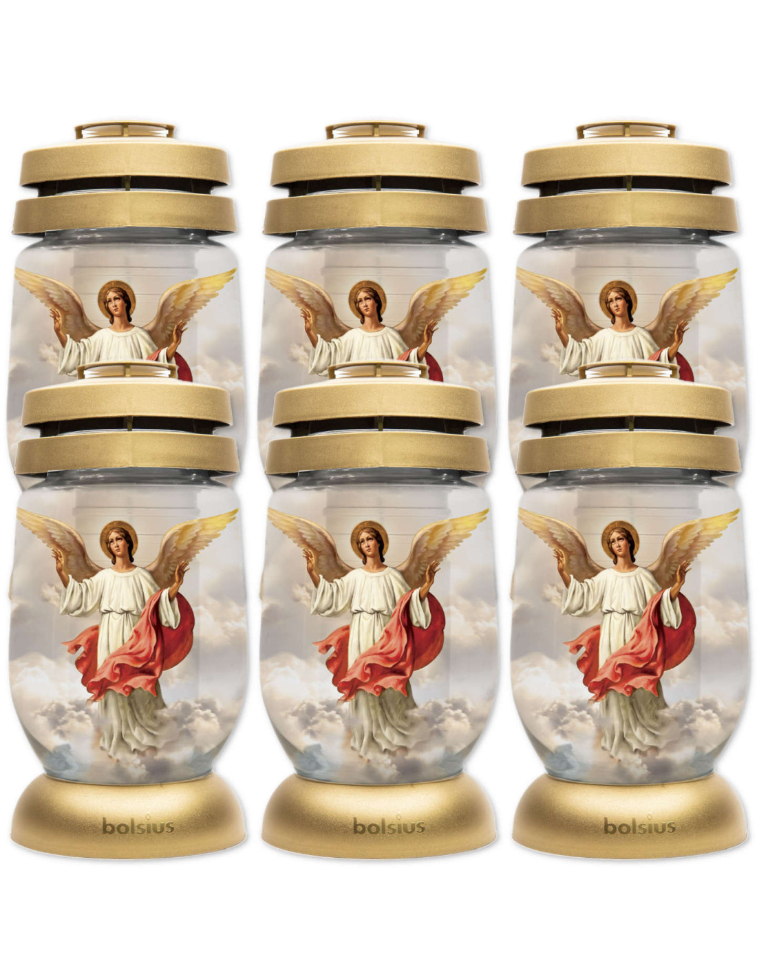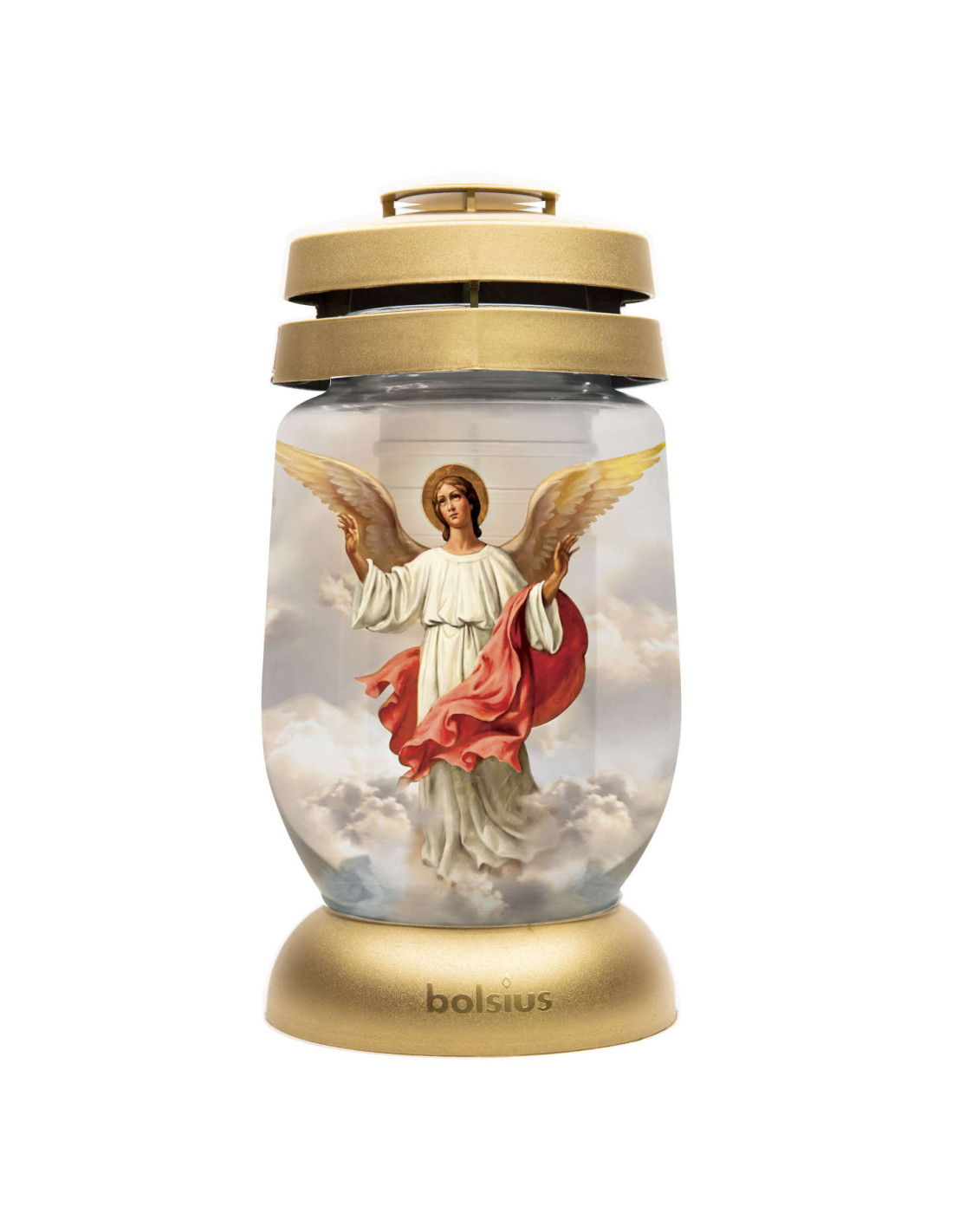 Ozdobne lampiony ze wzorem anioła. Wykonane z wysokiej jakości przeźroczystego szkła, przez które pięknie widać płomień. Dzięki dużej podstawie są bardzo stabilne, a za sprawą specjalnej konstrukcji oraz „kapturka” wkłady w ich wnętrzu są doskonale chronione przed wiatrem i wodą. Eleganckie i nowoczesne, wspaniale prezentują się jako główna dekoracja nagrobków. Pasują do nich parafinowe i olejowe wkłady, które palą się nawet 4 dni.